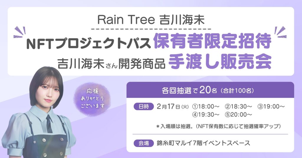 2月16日(月)18:00~21:00 NFT保有者限定・Rain Tree 吉川海未手渡し販売会